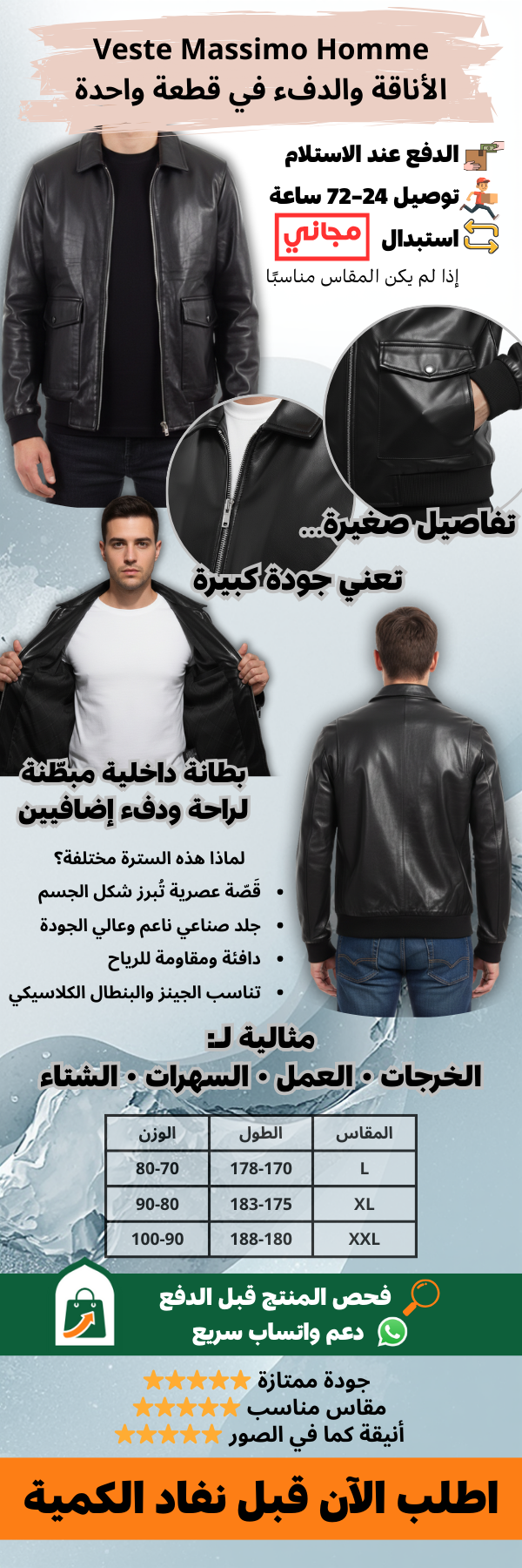 Ce blouson Massimo en cuir synthétique souple noire est une pièce élégante de style bombardier (Bomber) ou aviateur. Il se caractérise par un col de chemise classique, une fermeture éclair centrale argentée et une finition côtelée au bas de la veste et aux poignets. Les éléments distinctifs sont ses deux grandes poches à rabat plaquées sur le devant, fermées par un bouton pression, renforçant son allure utilitaire chic. L'intérieur est doté d'une doublure noire légèrement matelassée avec un motif à carreaux/losanges, offrant un confort supplémentaire.